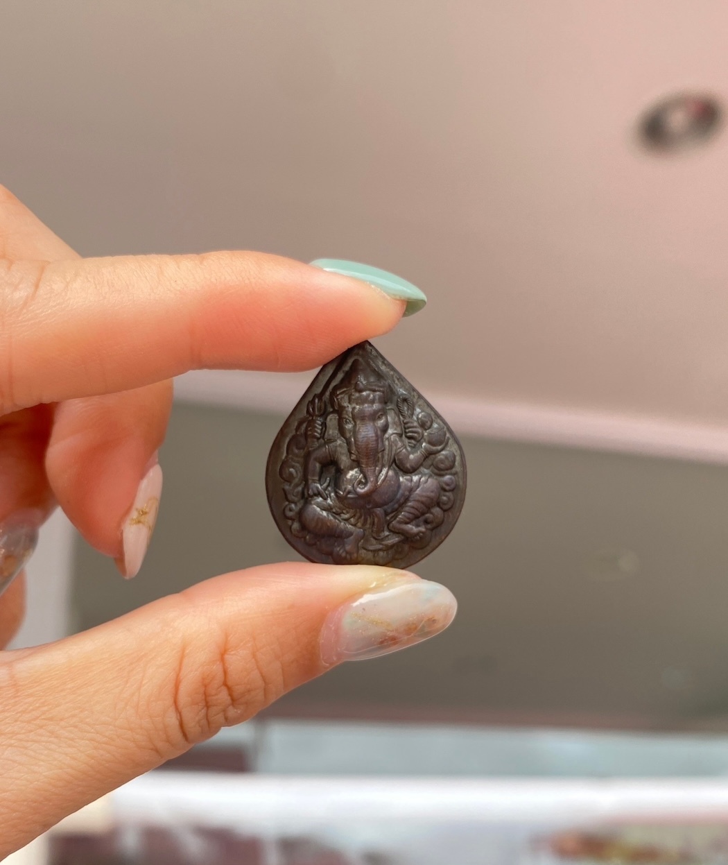 這面牌有兩面,正面的成功象神,可向祂祈求事業成功;另外一面是拉胡,在日全食的時候製作