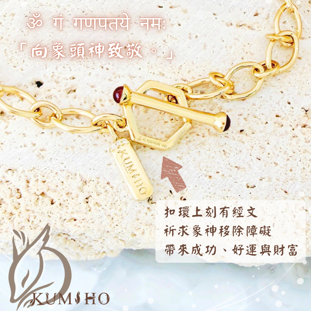這款手鏈最深的祝福,藏在 OT 扣的背面。特別刻上了象神的心咒,這是一段極具力量的古老梵文經文。