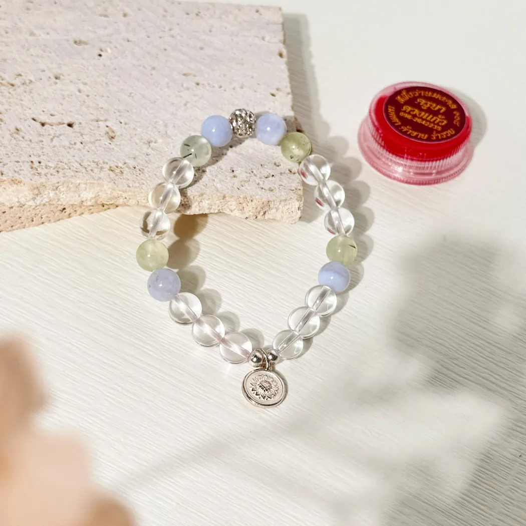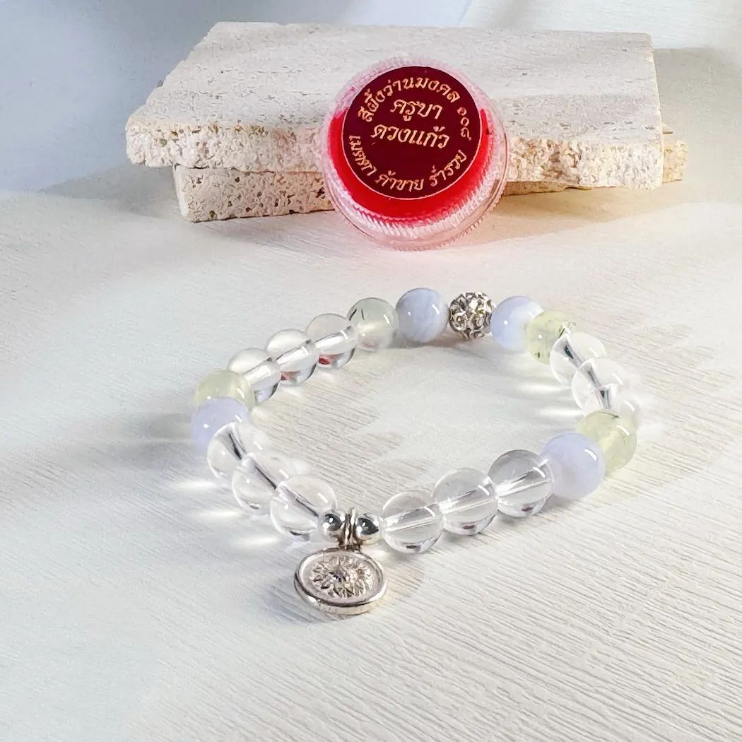 ◈ 材料:泰國高僧加持人緣油、925 純銀飾、8mm 白水晶、8mm 葡萄石、8mm 藍紋瑪瑙